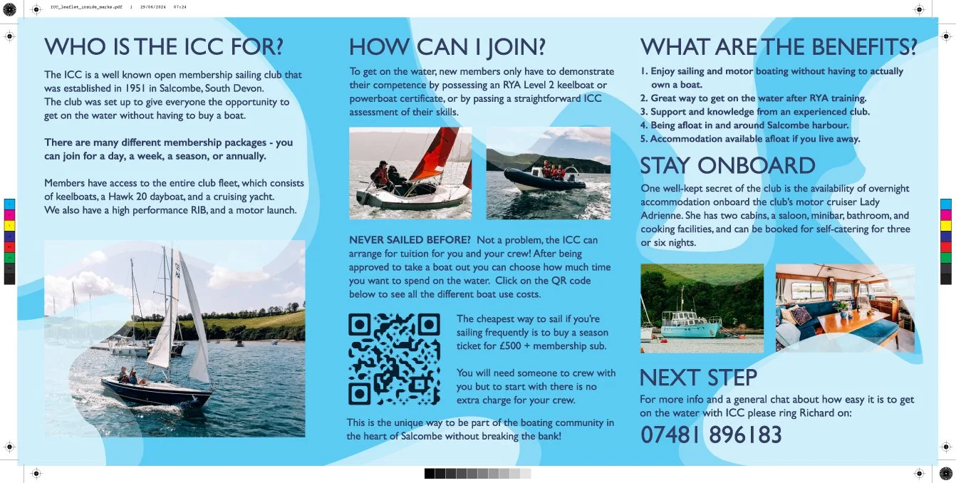 When the Egremont left to be repaired and then never returned, the ICC sadly went into something of a decline. It is now having life breathed back into it by Richard Martin, and I was tasked by him to create various marketing materials, including a new logo, a tri-fold flyer with QR codes, and a new website in Squarespace, that would show up in Google, and members could book out boats.
